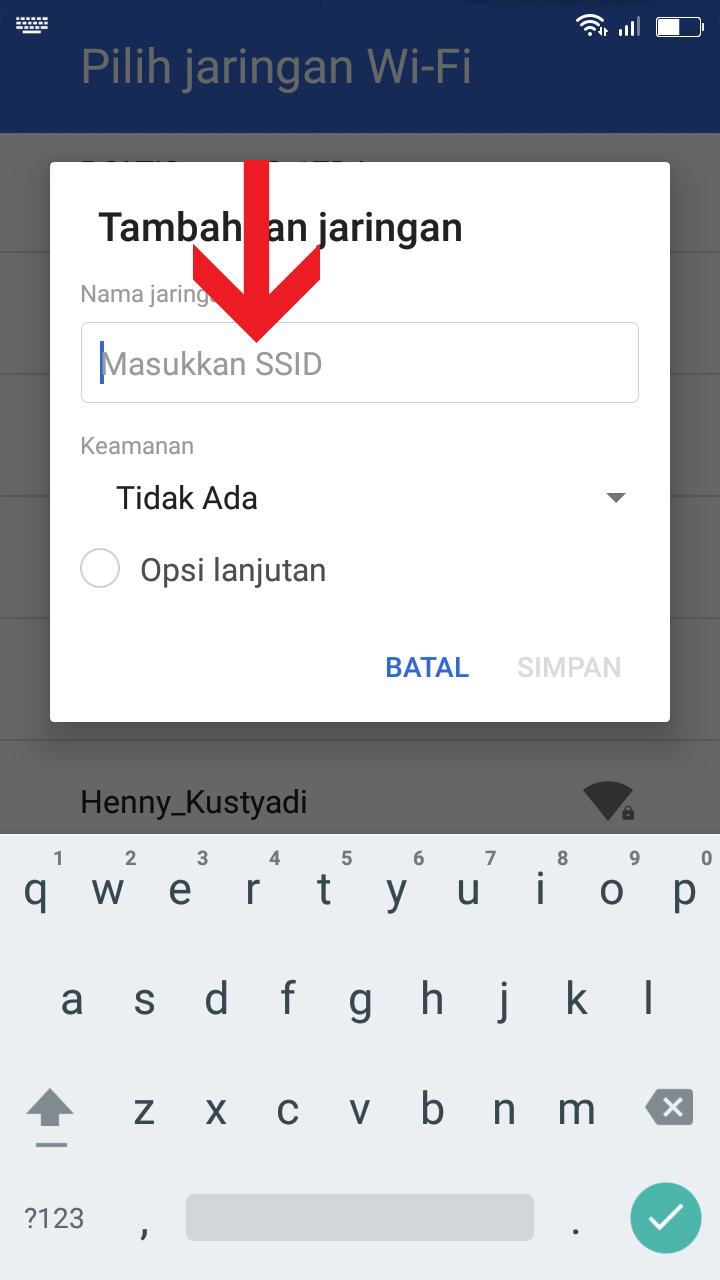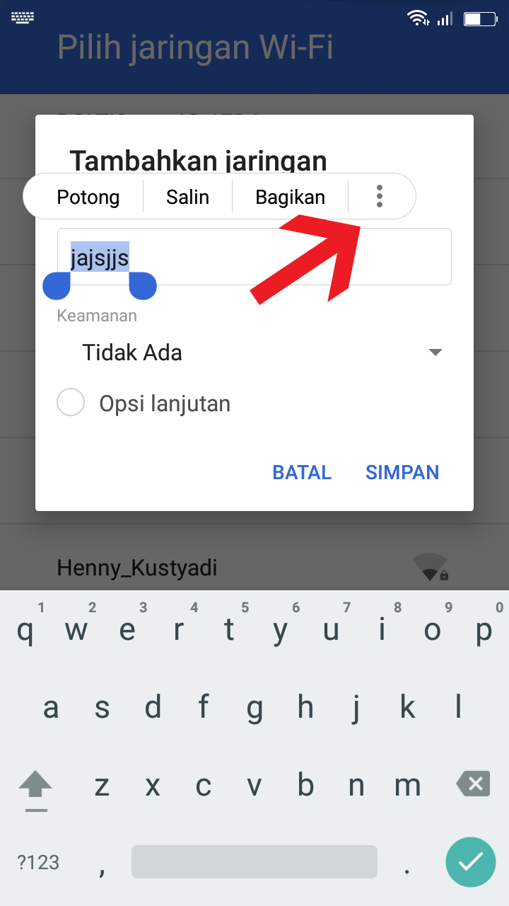 4. Pilih Tambahkan Jaringan Lain, lalu isikan nama apa saja, Setelah itu blok tulisan, pilih titik tiga dan pilih bantuan.