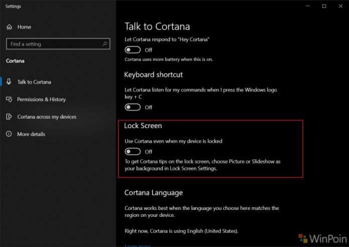 Bagi kamu yang ingin cara simple untuk mematikan cortana di lockscreen, kamu bisa masuk ke Settings > Cortana > Talk To Cortana, dan “uncheck” Use Cortana even when my device is locked.