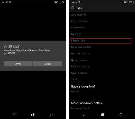 2| Download dan instal Interop Tool dari Mega. Ada dua cara melakukan ini. Yang pertama, kamu bisa menggunakan PC dan langsung mengikuti tautan yang saya sisipkan tersebut. Download, lalu salin dari PC ke perangkat Lumia 950 menggunakan kabel data. Cara kedua adalah download langsung menggunakan Edge di Lumia 950. Namun jangan lupa, kamu harus terlebih dahulu mengubah Edge ke Desktop Mode. Dari percobaan yang saya lakukan, lebih mudah menggunakan cara pertama ketimbang cara kedua. Jika sudah berhasil download. Gunakan File Explorer untuk menelusuri tempat kamu menyimpan paket Interop Tools tadi. Tap dan Instal!