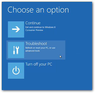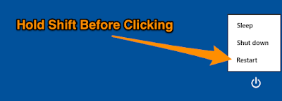 - Tahan tombol shift, lalu klik logo power di kanan bawah layar, klik “Restart” (tetap menahan tombol shift sampai Anda klik Restart), cara ini akan mengantarkan Anda ke menu berikutnya.
