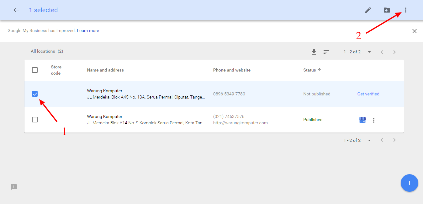 - Centang pilihan lokasi google bisnisku yang ingin kalian hapus, lalu klik menu dibagian pojok atas (lihat gambar dibawah ini)