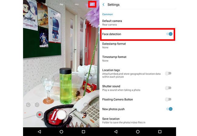 Buka aplikasinya, maka tampilan yang akan muncul pertama kali akan seperti gambar sebelah kiri di bawah ini. Pertama-tama, pilih ikon pengaturan alias settings di sebelah kanan atas. Lalu aktifkan Face detection. Hal ini diperlukan untuk bisa menggunakan fitur-fitur keren kamera yang berhubungan dengan wajah kamu.
