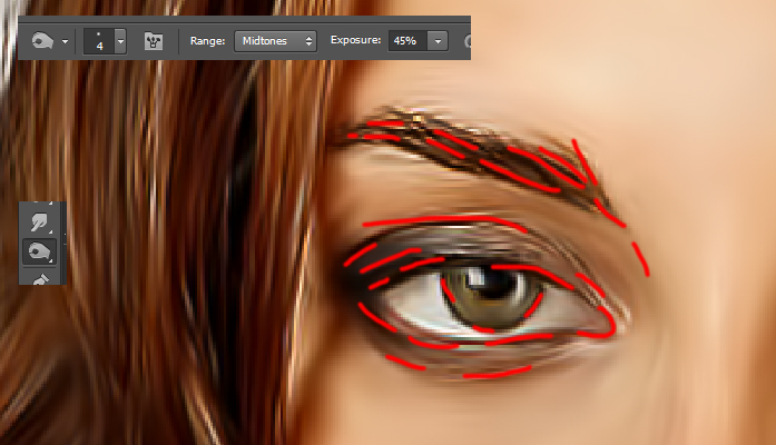 Aktifkan Burn tool (O) Dengan tipe brush yang lembut lalu sapukan pada bagian yang perlu kita pertegas warnanya, seperti bagian alis, mata dan bagian lainnya.