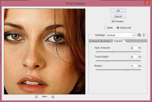 Untuk memberikan efek mengkilap yang lebih tajam kita beri filter smart sharpen.